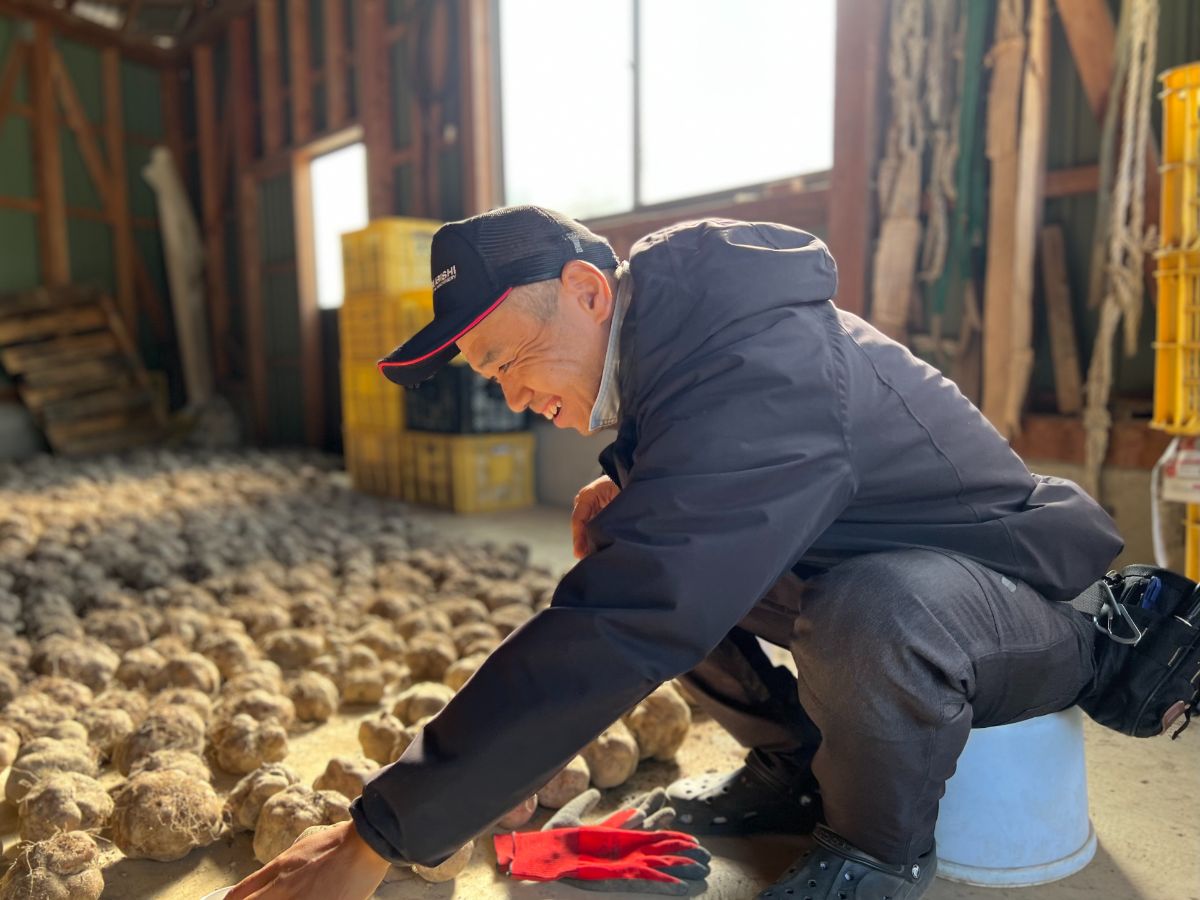 取材時、中出さんは山の芋の集荷に向けてひげ根をとる作業をしていました。ひげ根をバーナーで焼き、泥を落とす。そうすることで味だけでなく見た目も良くなり、受け取った人に喜んでもらえます。形も見た目も味も良い山の芋を栽培するための情報は、「やっぱり年配の先輩農業者からの実体験からの情報が一番フレッシュ。そういうことは、ネットにも上がっていなくて農業者の頭の中にあるから、話を聞いて参考にしています。」各種生産者組合に所属し、農業者どうしの横のつながりを広げることが、大きな学びを得るために大切だと中出さんは話します。